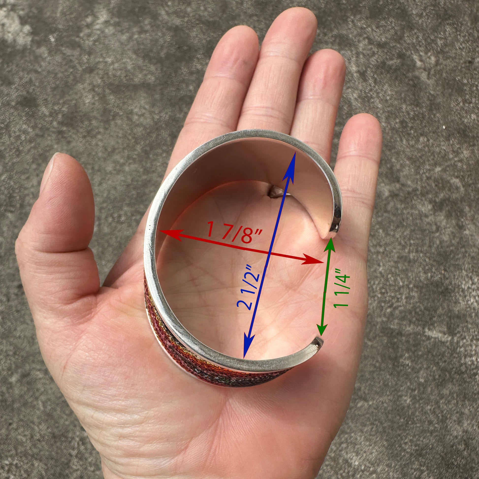 Wide Cuff inner circumference is 7 1/8", opening is 1 1/4", inside height is 1 7/8", inside width is 2 1/2"