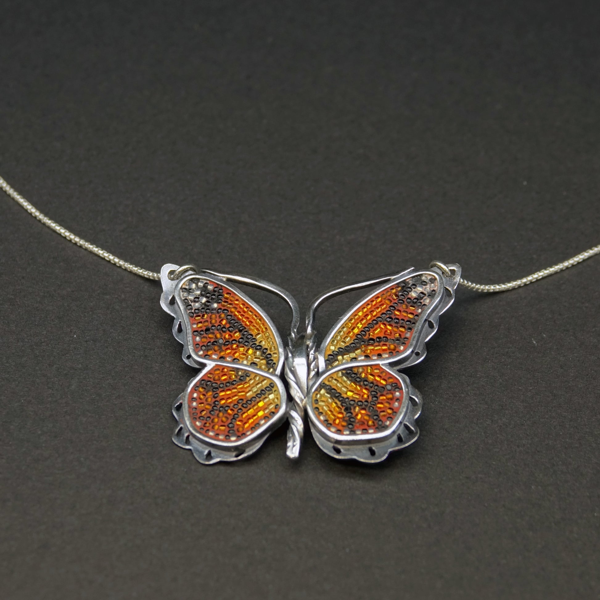 Monarch butterfly pendant on an adjustable 18-21 1/2" sterling silver chain. Butterfly is 2" x 1 3/4"